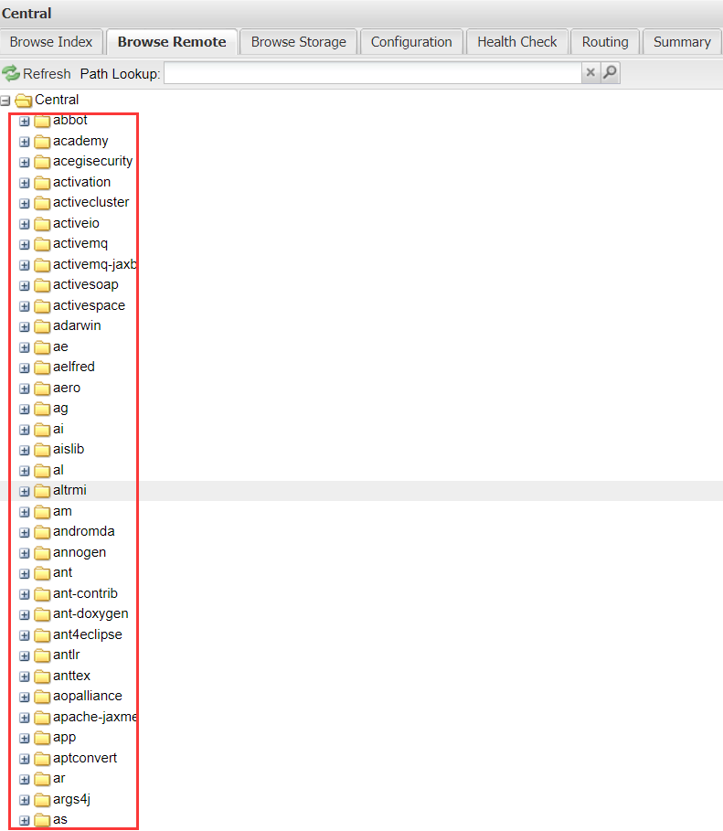 2. 重启 Nexus,在仓库列表中,选中 Central 代理仓库,然后点击 Browse Index 选项卡,结果如图 10 所示。